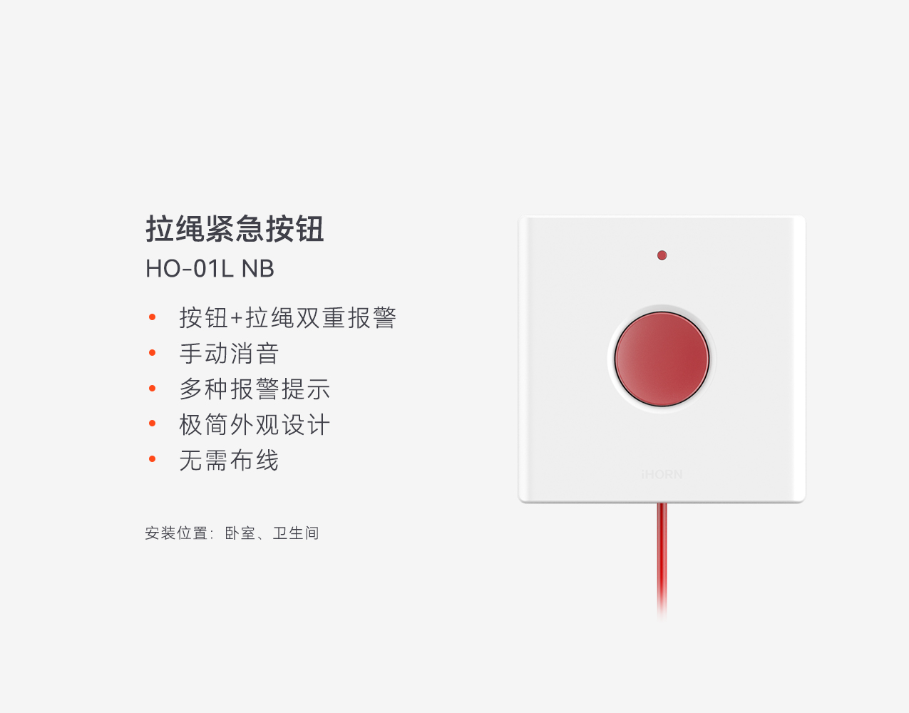 衛(wèi)生間是老年人很容易發(fā)生意外情況的地方,如地面濕滑滑倒、如廁久坐起身暈倒、洗澡久站重心不穩(wěn)跌倒等風(fēng)險(xiǎn)時(shí)刻存在,在衛(wèi)生間安裝拉繩緊急按鈕,當(dāng)老人感覺身體不適或摔倒等緊急情況,立刻觸發(fā)緊急按鈕,及時(shí)推送報(bào)警信息。